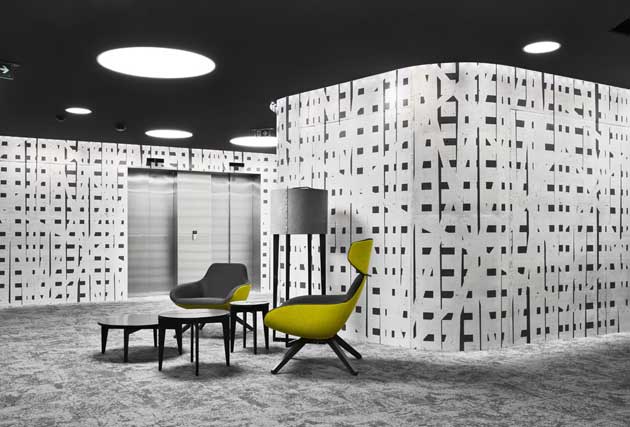 Con una pianta a zig zag costituita da elementi che creano spazi esterni simili a corti, l’edificio è realizzato su sette piani – di cui tre interrati destinati al parcheggio- e ospita 400 postazioni lavoro. Ogni livello adibito agli uffici è dotato di un proprio spazio ricreativo con aree relax, biblioteca e sala giochi.