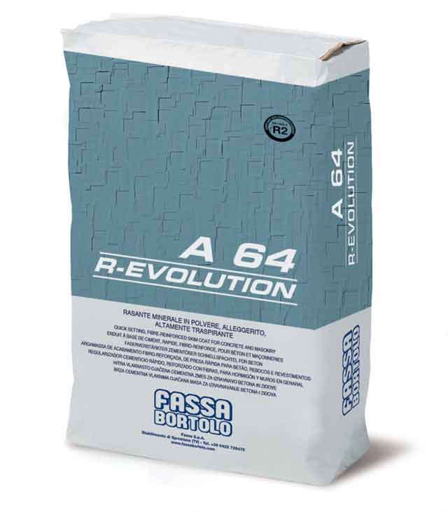 Il rasante fibrorinforzato a base minerale A 64 R-EVOLUTION è la novità Fassa Bortolo nell’ambito dei prodotti per la finitura e il ripristino di facciate. Le sue caratteristiche principali sono l’elevata stabilità dimensionale e le ottime performance meccaniche dovute alla presenza di fibre che lo rendono utilizzabile per la rasatura in interventi di rinforzo strutturale di murature danneggiate e nel ripristino di elementi in calcestruzzo e di facciate degradate con rivestimenti plastici o in mosaico.