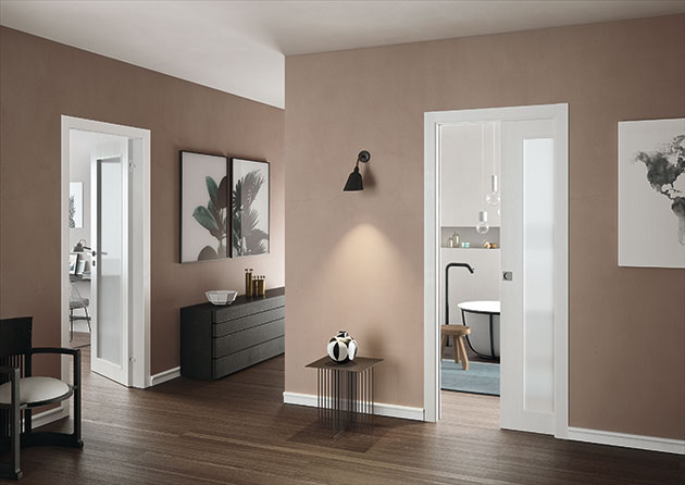 Comfort Luce offre invece un’anta comprensiva di pannello centrale in vetro acidato che ne esalta la leggerezza compositiva e sottolinea la geometria delle forme della porta. Maggiore luminosità e salvaguardia della privacy sia in versione a battente sia scorrevole per il modello Base e Base Doppio.