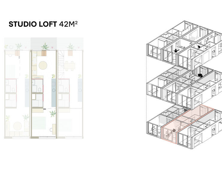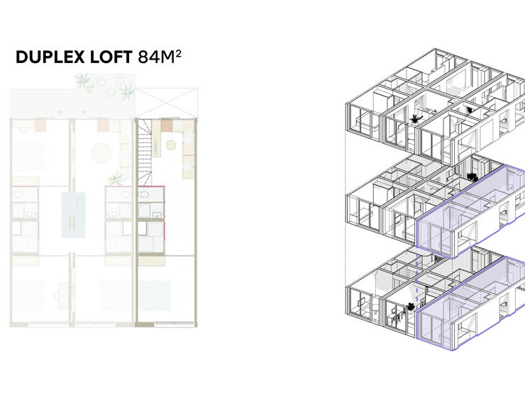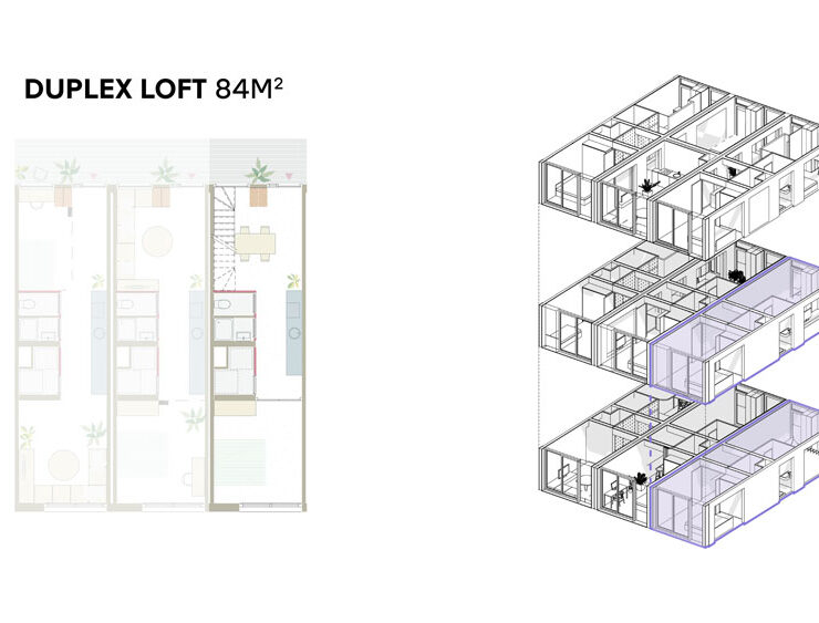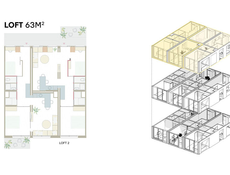 Il sistema combina il design modulare con metodi di prefabbricazione in calcestruzzo e legno, un mix diversificato di tipi di loft e programmi flessibili che possono facilmente adattarsi nel tempo.