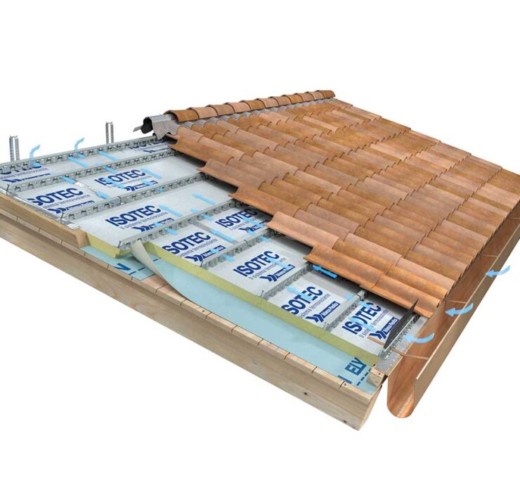 Nei prospetti, le facciate ventilate realizzate con Isotec Parete, finite con doghe di rivestimento a correre in grès effetto-legno, si alternano a piccole porzioni intonacate realizzate a cappotto; il tetto è coibentato con pannelli Isotec Linea a diretto contatto con la soletta in laterocemento.