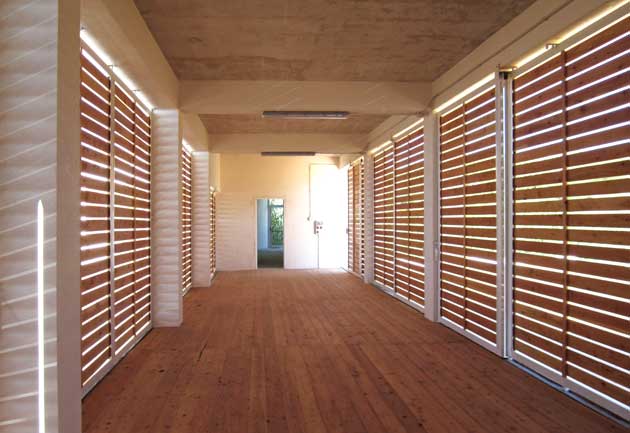 Il progetto predilige l’uso di materiali in assonanza con il luogo: il palco e gli ingressi nord e sud sono rivestiti in legno e il retropalco si presenta come una sorta di box chiuso da pannellature lignee.