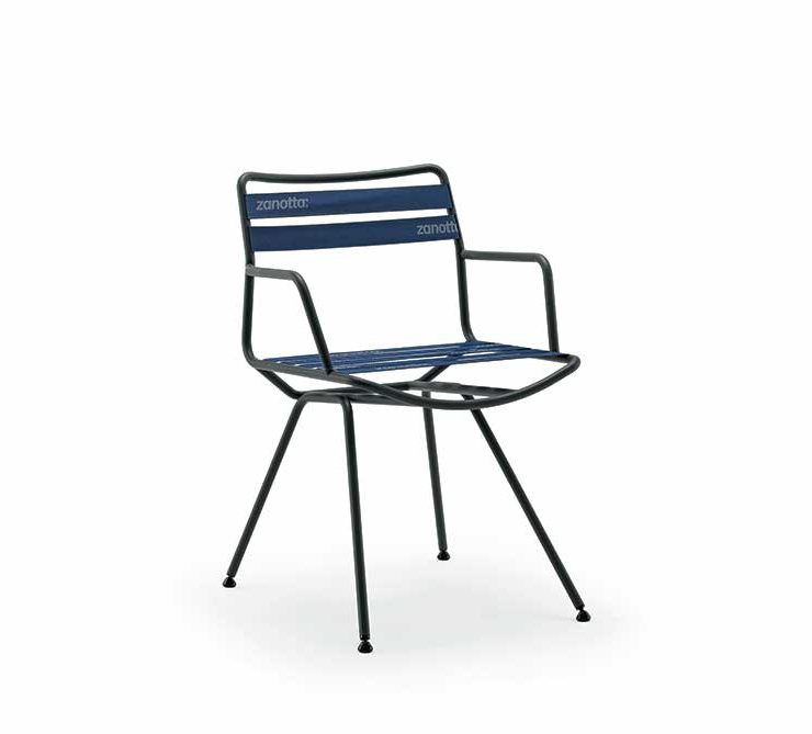 Categoria design per l’abitare. Dan, Zanotta. Design Patrick Norguet. Una sedia da tavolo, con o senza braccioli, composta da pochi elementi: seduta e schienale sono realizzati con cinghie elastiche tese e fissate sulla struttura con un sistema a incastro a scomparsa. Il telaio in tubolare d’acciaio piegato e verniciato (nei colori grigio ferro o nero opaco) è sottile ed essenziale, e si compone di pochi elementi privi di viti. La sedia è facilmente smontabile per la manutenzione e a fine vita i singoli componenti sono riciclabili.