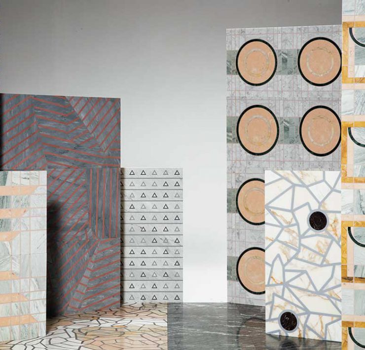 Categoria Design dei materiali e dei sistemi tecnologici. Marble Patterns, delsavio 1910. Sottili lastre di marmo, di dimensioni e peso contenuti, ricavate da piccoli blocchi solitamente considerati scarti. Ispirandosi alla tradizione palladiana locale sono stati scelti marmi del Friuli Venezia Giulia (Grigio Carnico e Fior di Pesco Carnico). I motivi decorativi personalizzabili vengono forniti in lastre prefinite realizzabili su progetto per ottenere diversi formati e sono costruiti abbinando il marmo al cemento colorato.