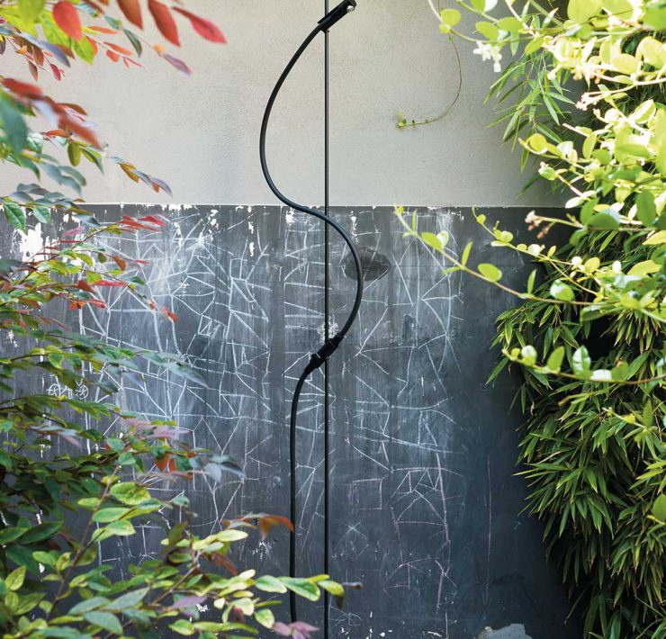 Categoria design per l’abitare. Open Air, Agape. Design Benedini Associati. Mobile e flessibile, riduce la doccia ai componenti essenziali e può essere collocata negli spazi aperti. Ha solo la regolazione di portata, con il miscelatore monocomando ARUB1113_ a gestire la temperatura. Il tubo flessibile è completo di attacco rapido per giardino. Il piatto è in Cementoskin® grigio scuro, innovativo impasto di cemento e resina arricchito di inerti accuratamente selezionati, che garantiscono elevate prestazioni tecniche e strutturali anche con spessori molto ridotti, resistenza allo sporco e stabilità nel tempo.