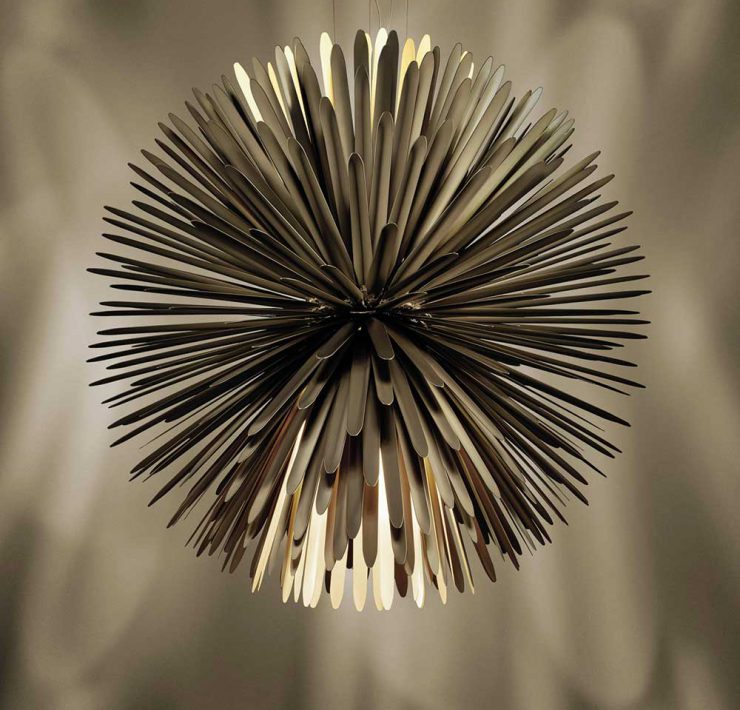 Categoria design per l’abitare. Sun-Light of Love, Foscarini. Design Studio Tord Boontje. Una lampada dal forte impatto decorativo, con una doppia fonte luminosa, puntuale diretta verso il basso e indiretta diffusa verso l’alto. Due finiture cromatiche ne modulano il carattere: l’oro la impreziosisce, il bianco si armonizza a contesti più minimalisti. L’uso di un Led COB ad alta efficienza tradizionale accoppiato a un Led COB a bassissima tensione e alta intensità rende possibile pilotare le due sorgenti con un singolo driver. L’ottica inferiore garantisce un angolo di circa 100° e, grazie all’uso del silicone, la parte ottica del gruppo luce occupa solo 11,3 millimetri. La lampada è facilmente smontabile.
