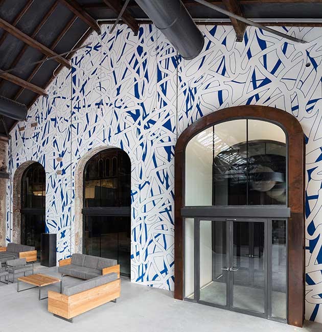 Negli stessi giorni, durante i preparativi per il Big Bang, la grande festa inaugurale delle OGR Torino, nell’atrio che segna l’accesso alle OGR Cult, condiviso con Snodo – area ristorazione delle OGR – si è lavorato al maestoso lavoro di Arturo Herrera Track: il dipinto murale, così come lo ha immaginato l’artista, combina linee di varie dimensioni e spessori fino a formare un intricato reticolo che ricorda il tracciato di binari ferroviari o una serie di sentieri che si incontrano dipanandosi in varie direzioni, suggerendo anche un intreccio di rami e alberi che si protendono verso l’alto.