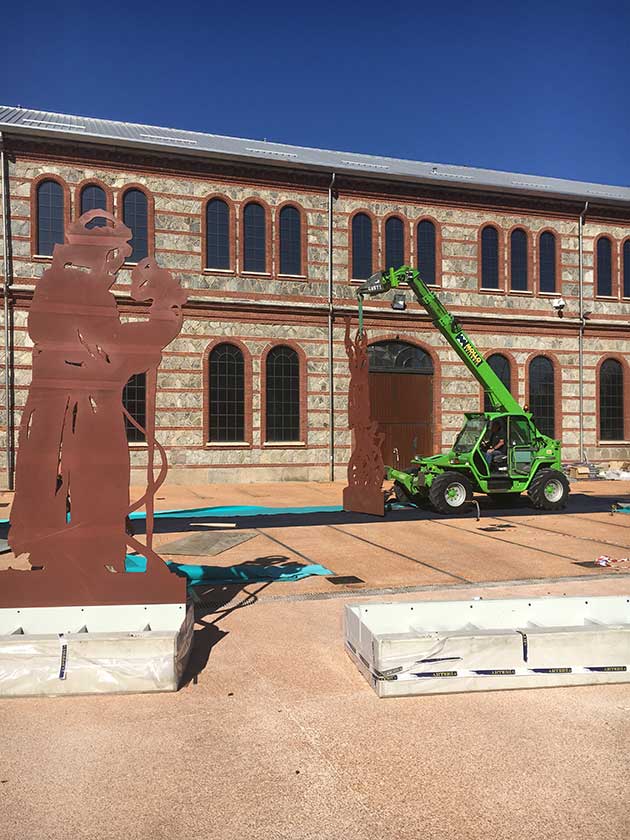 Dopo mesi di intenso lavoro da parte di William Kentridge e del suo team di produzione le statue sono state imbarcate in direzione Italia dal Sudafrica. Dopo circa un mese di viaggio, le opere arrivano a Genova e, da lì, nella Corte Est, cortile che segna l’accesso alle OGR – Officine Grandi Riparazioni di Torino. Gli schizzi e i render che circolavano da mesi, preparati minuziosamente e contenenti ogni dettaglio tecnico, non avevano preparato il team di OGR alla visione di queste grandi placche di metallo di grandi dimensioni (410 x 350 m circa) sollevate da una gru.
