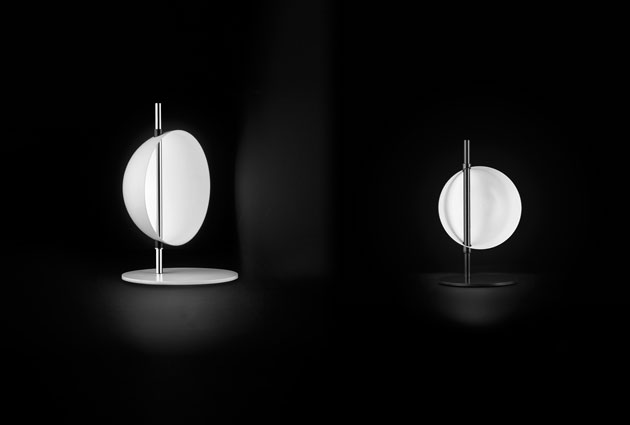 Superluna è una lampada LED bassa tensione a luce indiretta e riflessa, realizzata in metallo verniciato, dotata di semisfere rotanti che permettono di direzionare la luce: una per la versione da tavolo e da parete e due per la versione da terra.