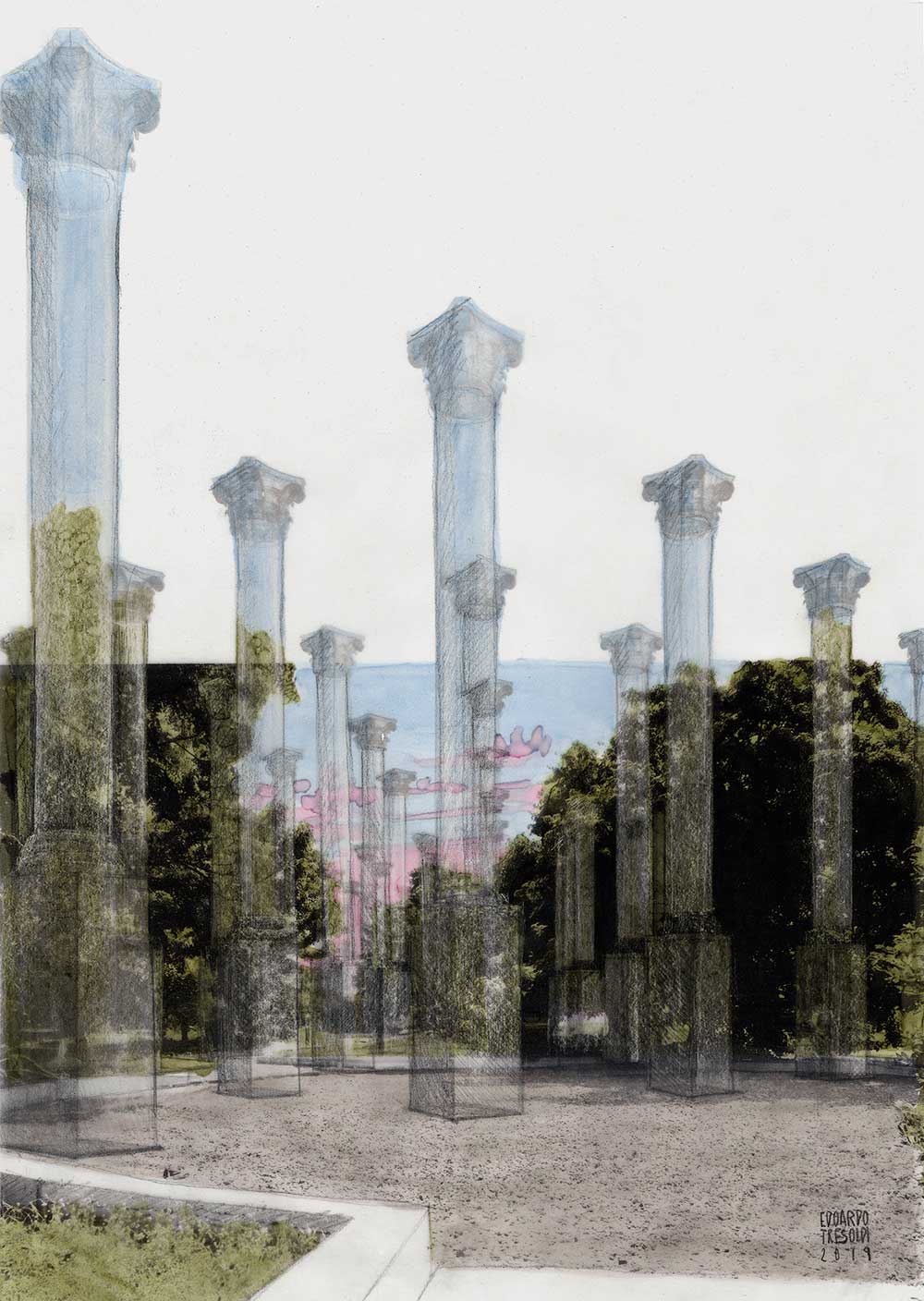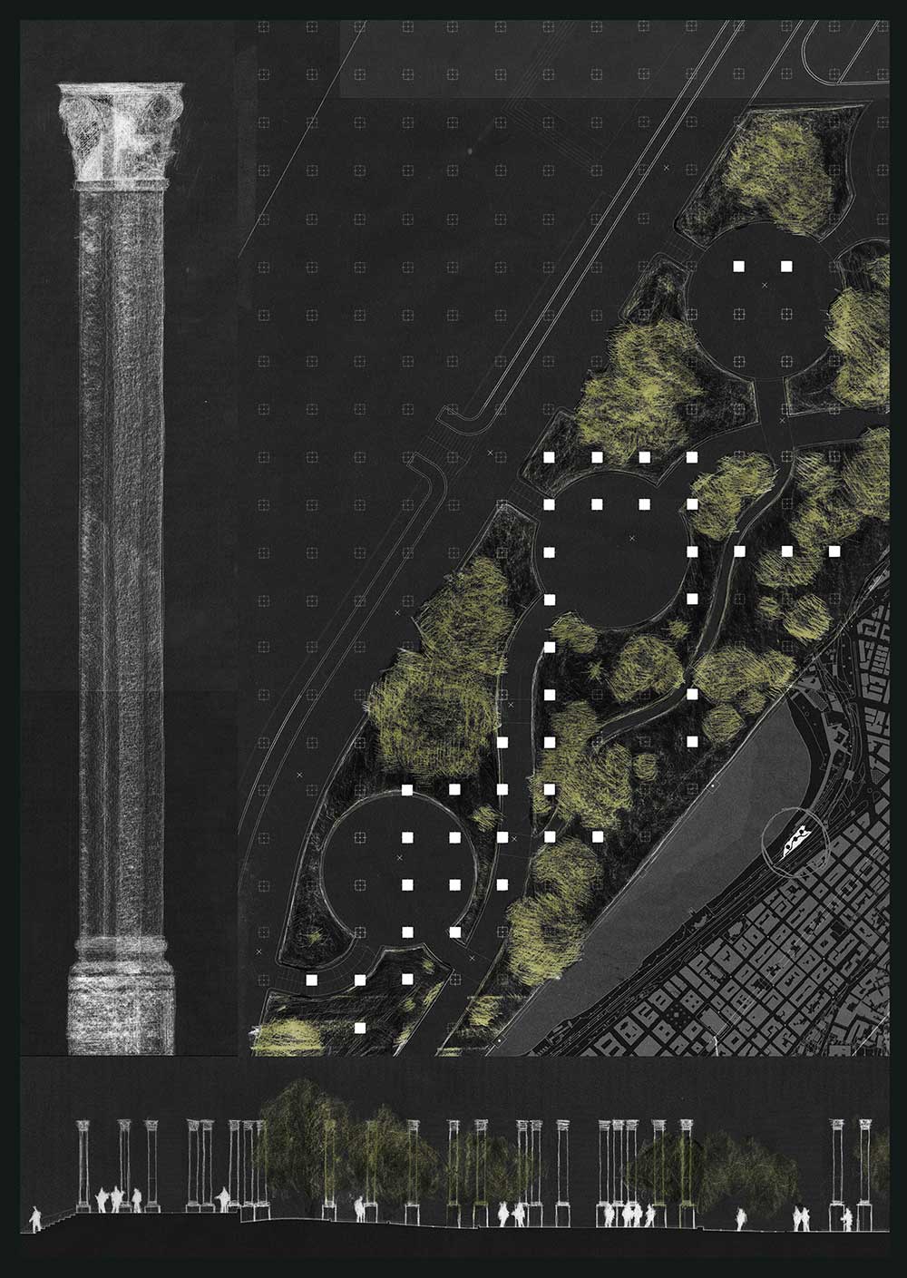 L’architettura aperta –un colonnato di 46 colonne che raggiungono gli 8 metri di altezza all’interno di un parco pubblico– si presenta come un monumento attraversabile e completamente fruibile a cittadini e visitatori.