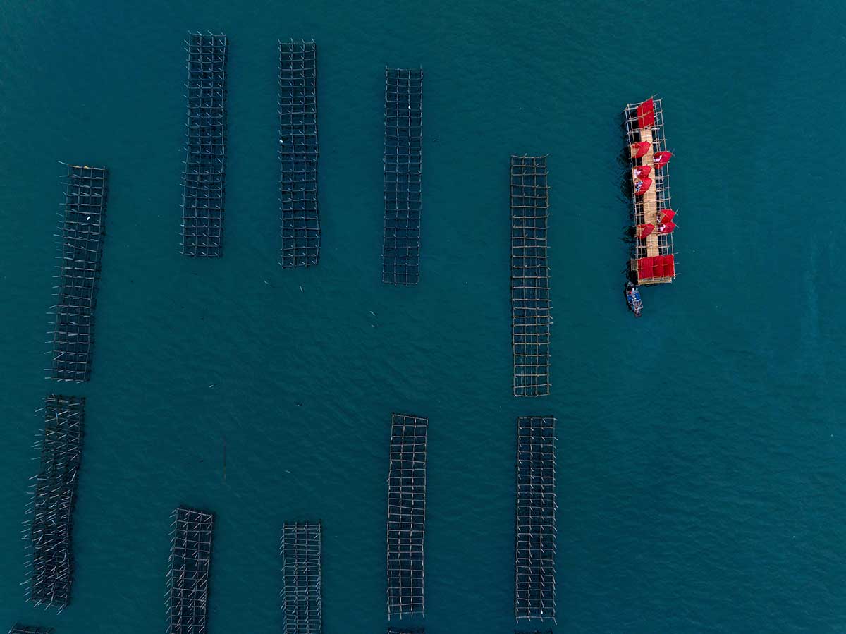 Di tronchi di bambù anche per la pavimentazione del padiglione, dove appoggiarsi per consumare ostriche fresche appena pescate.