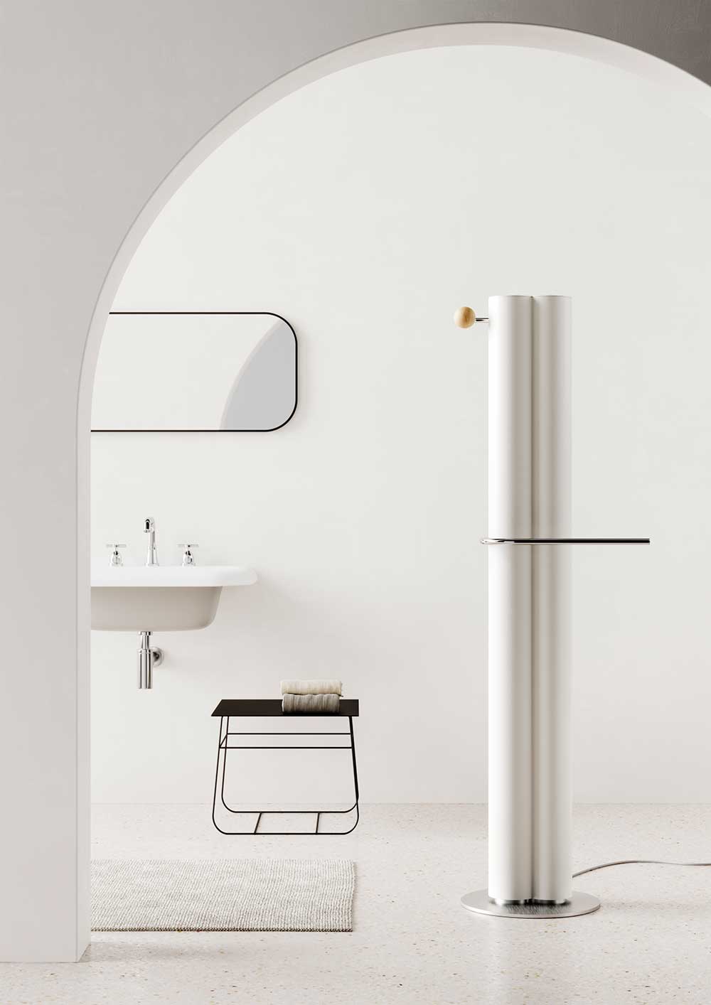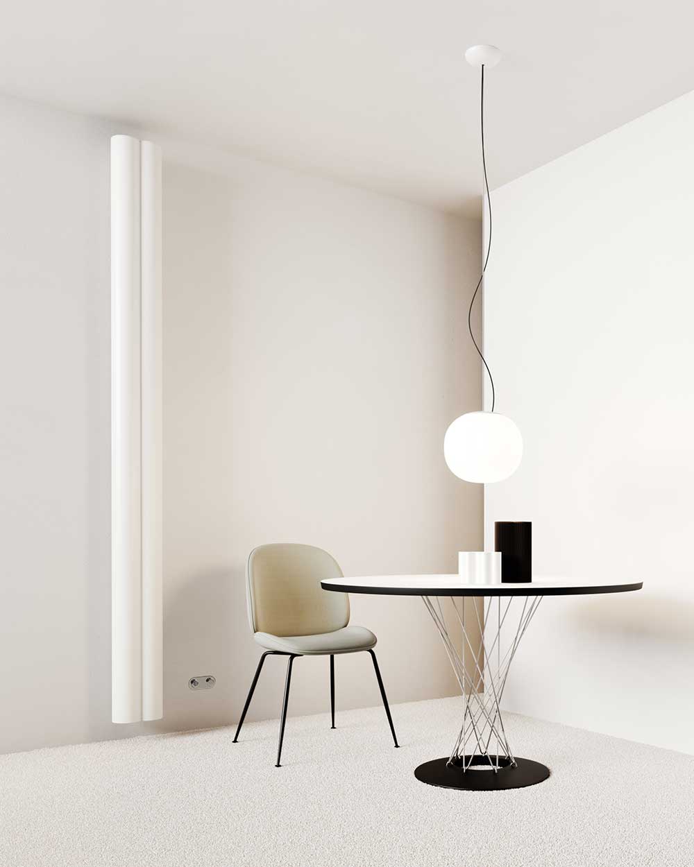 Dalle forme essenziali e morbide, Ottolungo diventa colonna architettonica nello spazio abitativo, specie nella versione elettrica free-standing, dove genera particolari giochi di ombre sulla parete di fondo.