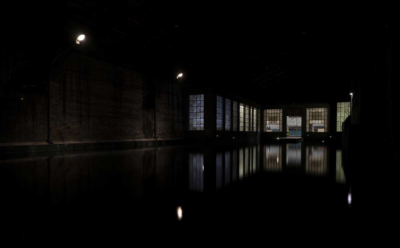 L’ultimo spazio si apre su un mare notturno e agitato che sbatte contro le sue pareti. Una fila di lampioni stradali semi-sommersi suggerisce che di fronte a noi dev’esserci stato un piazzale e una strada fino a poco prima, su cui ora non scorre che acqua scura.