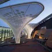 Laddove necessario, sono state previste travi reticolari circonferenziali che forniscono rigidezza al guscio e divengono elementi di sostegno delle travi intermedie, inserite per limitare a non oltre 6 metri la lunghezza degli arcarecci. 1.400 le tonnellate di acciaio utilizzate per costruirlo. All’interno di Expo Center troviamo un grande auditorium, una Open Plaza e uno spazio meeting.