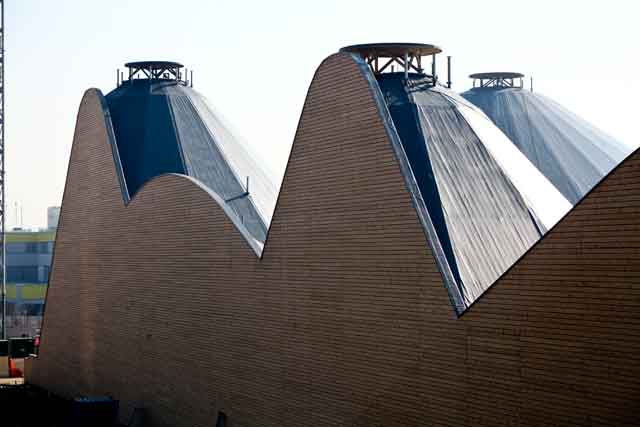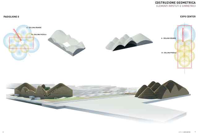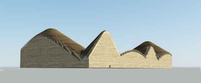 Sembrano due sezioni di ambienti montuosi con coni a punta tonda rivestiti a veneziana in legno massello. In pianta sono rettangolari e utilizzando la schematizzazione delle curve di livello riproducono montagne, colline e valli. Ciascuna collina è sorretta da travi reticolari in acciaio zincato disposte a raggiera, a loro volta costituite da profili laminati aperti e tubolari di dimensioni varia bili in funzione della luce. In acciaio anche le colonne di sostegno delle travature reticolari. La scelta di questo materiale è lungimirante nell’ottica del riutilizzo post evento.