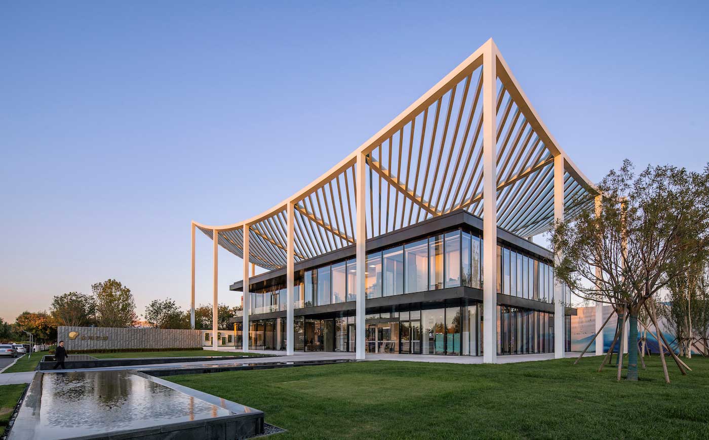 Semplice come un foglio di carta, il tetto realizzato in acciaio verniciato a polvere che definisce il centro di accoglienza di Binhai rende il progetto leggero ed evocativo. Si credeva che gli angoli rovesciati, caratteristici degli antichi edifici cinesi, fossero di buon auspicio, oltre alla funzione primaria di deviare l’acqua piovana.