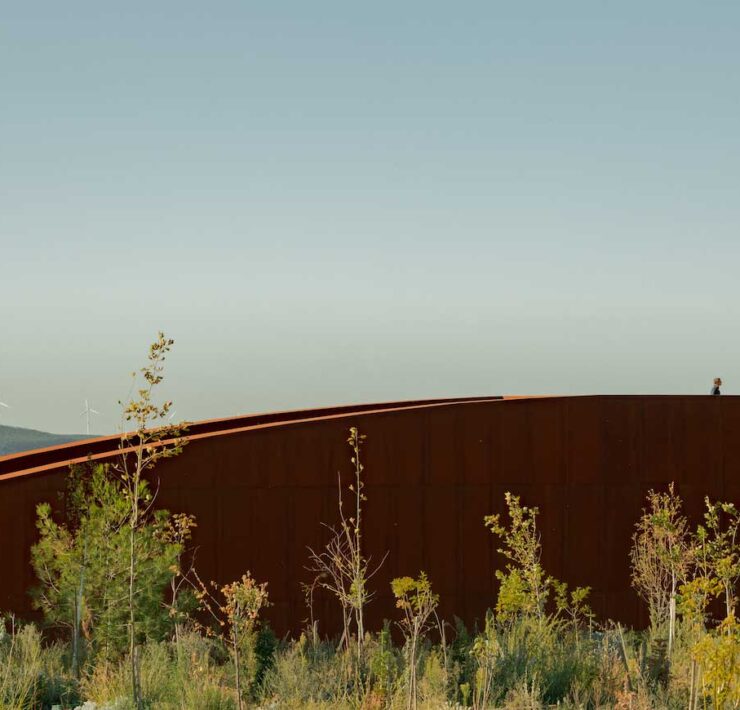 Appoggiato su gambe sottili, spesse solo 45 cm, il tetto si alza fino a 18,5 metri nel suo punto più alto e si estende su una superficie di 1500 metri quadrati. La struttura è stata saldata sul posto (le sezioni curve sono state prefabbricate) e poi rifinita a mano per creare una superficie liscia e lucida.