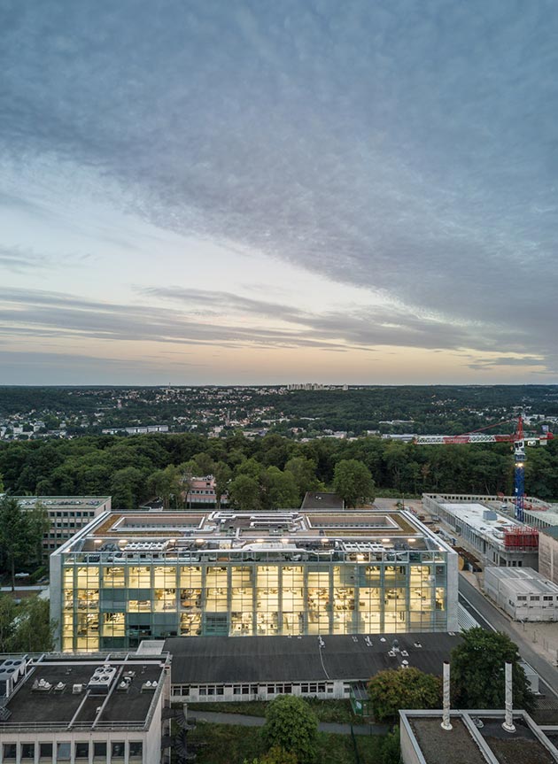In alto, il complesso universitario nel contesto di Parigi-Saclay; sopra, una vista dall´alto dell´edificio (©foto Fernando Guerra-FG+SG)
