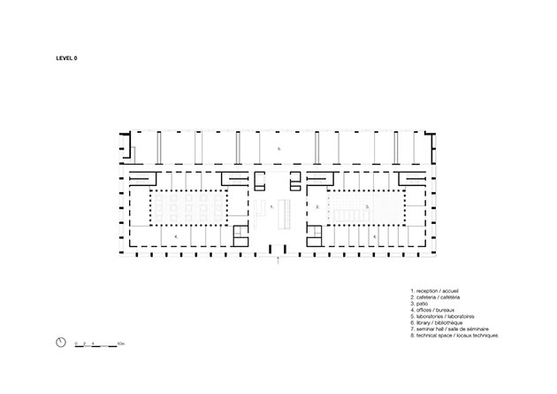 L´edificio rettangolare di 10mila metri quadrati, che si sviluppa su quattro piani fuori terra e due interrati, è suddiviso in due parti distinte: la parte nord, che ospita i laboratori; e quella a sud che raggruppa gli uffici e gli spazi di riunione.