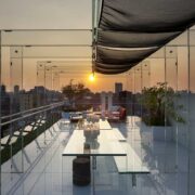 Due delle pareti della sala fanno da sfondo alle pannellature Optical progettate da Ulian nell’ottica del riuso, ottimizzazione e valorizzazione del materiale. i pannelli sono infatti realizzati con marmi comuni nel territorio toscano e di facile reperibilità: marmo di Carrara, Bardiglio e altre varietà, dal bianco al grigio scuro ai toni caldi del beige.
