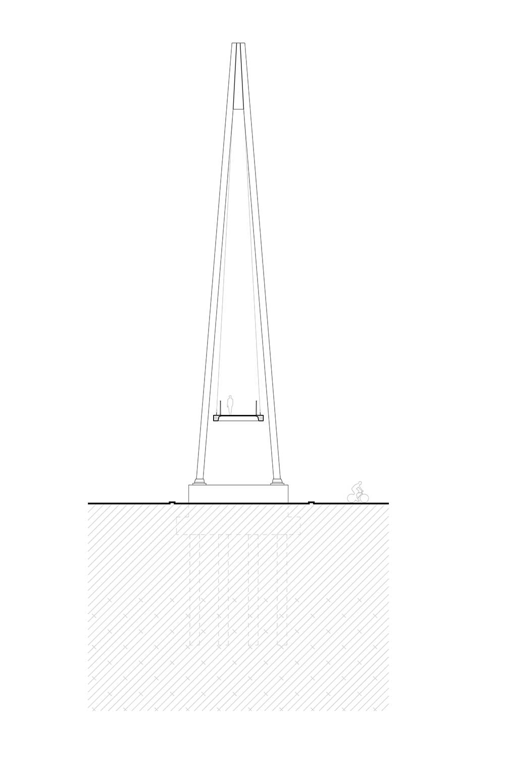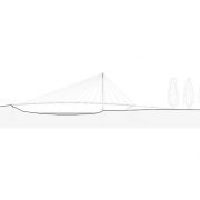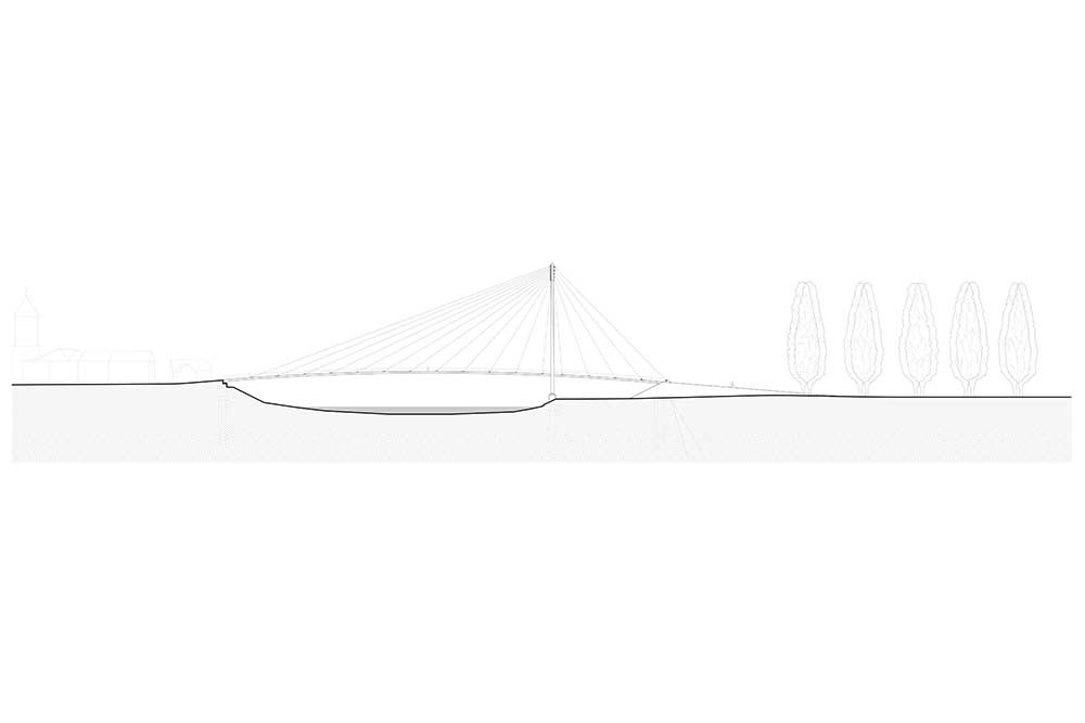 La passerella è collegata al paesaggio da un viale di querce appena piantate lungo la strada sul lato Bukol. Gli alberi cresceranno fino all’altezza del pilone.