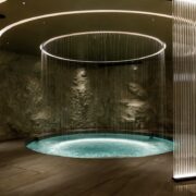 La porta d’ingresso si trova all’interno di un portico incassato, avvolto nello stesso mattone lineare scuro del prospetto anteriore, che crea un classico effetto di ‘compressione e rilascio’ quando gli ospiti attraversano l’atrio e sperimentano per la prima volta il vuoto a tripla altezza.