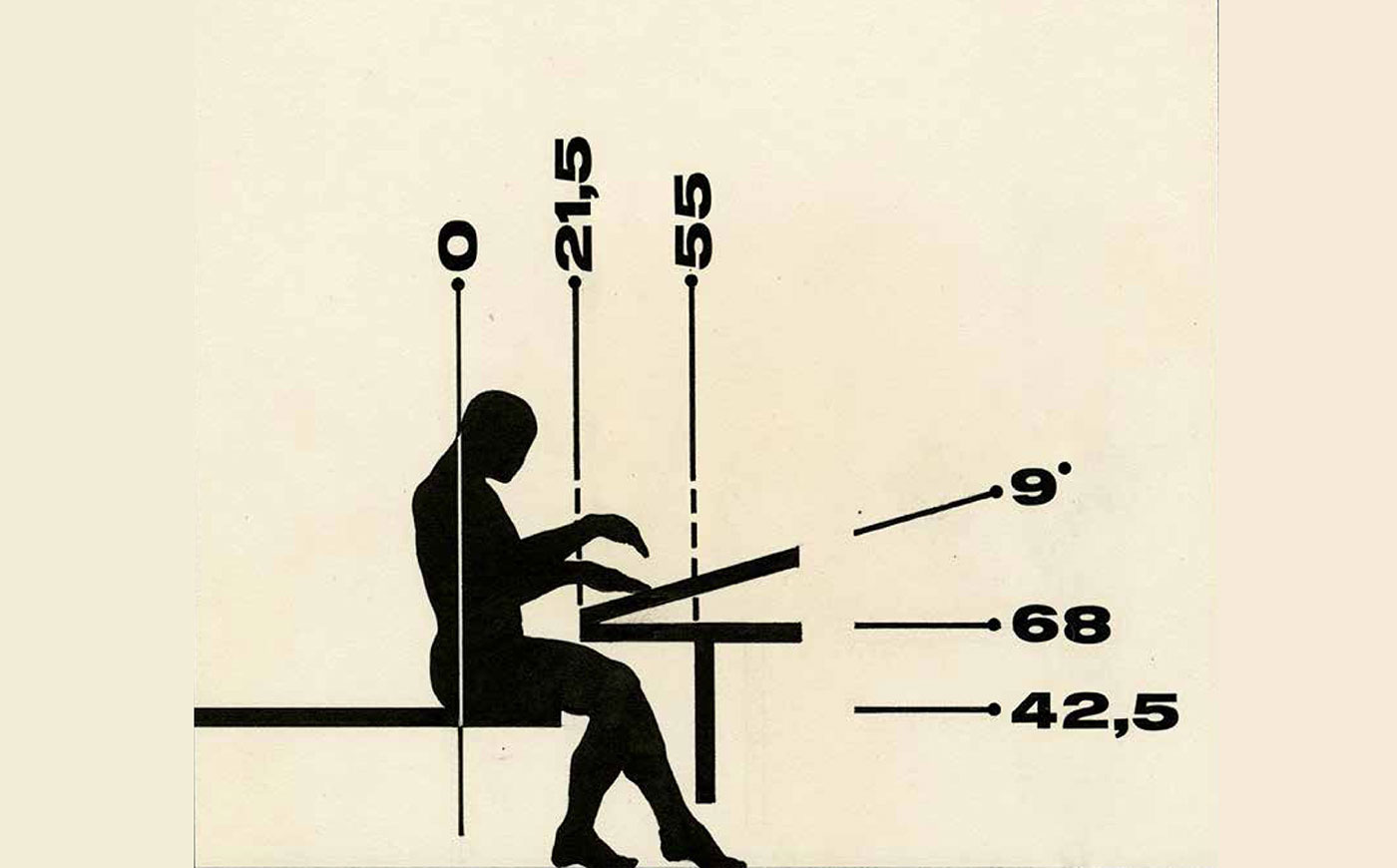 Dettaglio della mostra Podium 16, ph. ©Martina Bonetti. In apertura, Ettore Sottsass, studio ergonomico per la postazione alla consolle per un opuscolo sull’Elea, 1957-60.