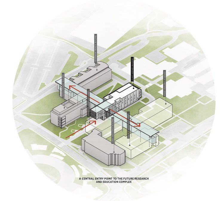 Il masterplan prevede una serie di edifici per laboratori che si affiancano a un elemento vetrato che funge da spina dorsale architettonica e da tessuto connettivo per la vita sociale e di ricerca del complesso.