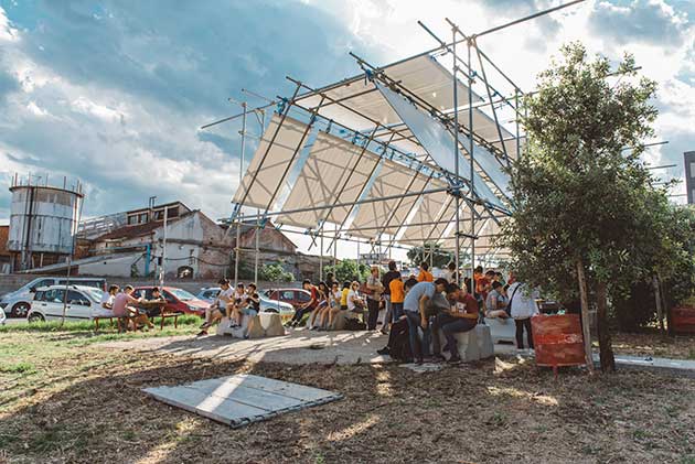 Shelter #1 è una struttura itinerante, montata per la prima volta nel quartiere del Macrolotto 0 di Prato, all’interno di un ex piazzale industriale abbandonato. Nell’attesa della futura cantierizzazione del piazzale per la realizzazione di un parco, l’area è stata aperta sotto forma di spazio pubblico temporaneo, permettendo alla cittadinanza l’immediata fruizione di un bene acquisito dalla pubblica amministrazione. L’intervento fa parte di una serie di progetti pilota sulla sicurezza urbana sviluppati dal Comune di Prato e finanziati da Regione Toscana, per promuovere forme attive di controllo del territorio. La struttura è stata di supporto a una serie di attività estive che hanno animato un quartiere privo di spazio pubblico, dove risiede una delle comunità cinesi più grandi d’Europa. La costruzione, realizzata con sistema tubo-giunto, è stabilizzata da trentadue jersey e poggia su una piattaforma di asfalto assunta come matrice dimensionale del progetto. La struttura è quindi il risultato di una serie di dimensioni fisse, vincolate da elementi standard, che trova nel processo di progettazione e nella precisa esecuzione la sua forma finale. La creazione del giardino attorno alla struttura è stata condotta mediante una serie di cantieri collaborativi, addomesticando la vegetazione e riutilizzando i materiali trovati in loco. Shelter#1 è stato smontato a dicembre 2018, in primavera verrà rimontato con una nuova forma in un quartiere periferico della città. |