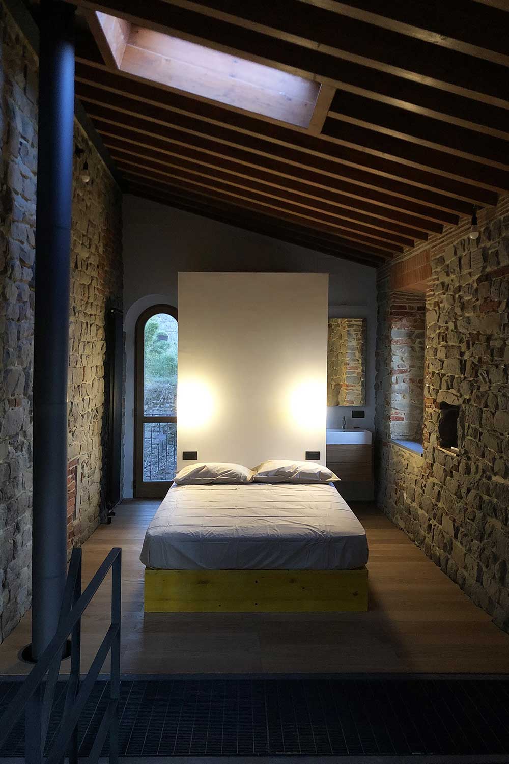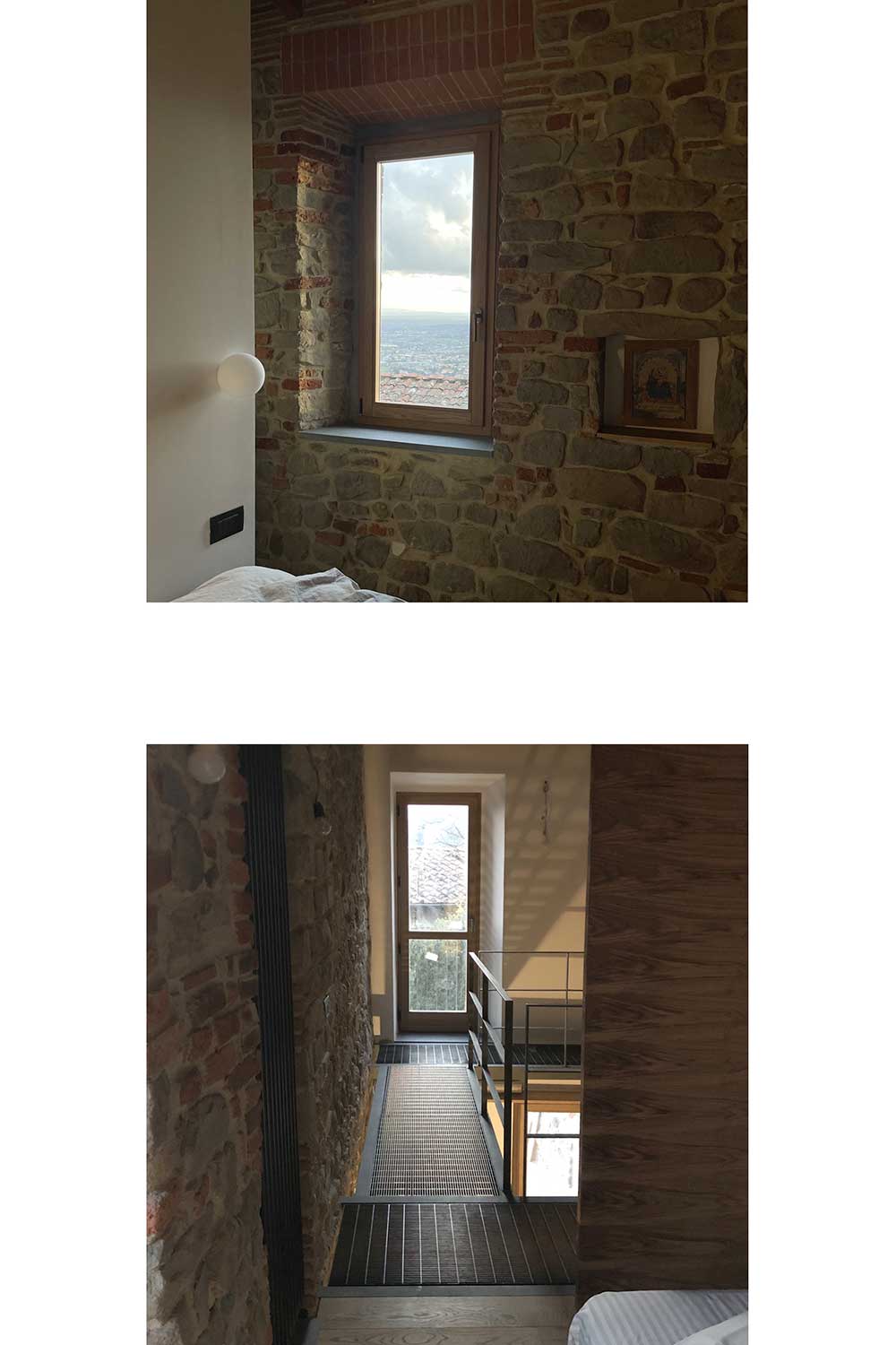 Per quanto riguarda la tipologia costruttiva si è scelta una soluzione completamente a secco realizzando solai in travicelli di legno lamellare poggiati su profili perimetrali di acciaio che determinano la cerchiatura orizzontale interna. Le pareti esterne e interne sono state lasciate con pietre a vista.
