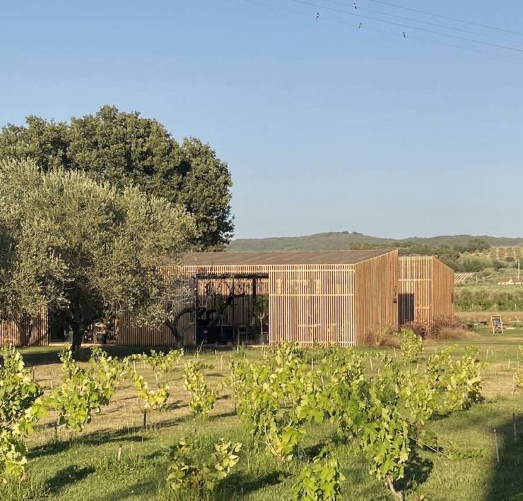 L’area in cui sorge la nuova cantina o, meglio, la ristrutturazione di quella esistente, con il mantenimento della barricaia e la nuova edificazione delle aree di produzione dei vini, si colloca quasi al centro della tenuta rispetto alle principali vie di accesso e in adiacenza al Podere Guado al Tasso.
