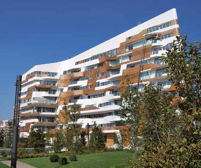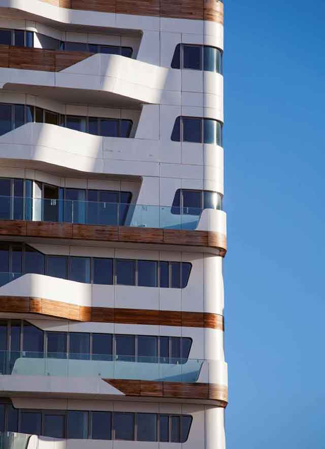 45.000 mq di rivestimenti e parapetti in alluminio, doghe di cedro e vetro; 2.876.353 pezzi singoli assemblati in opera. Sono alcuni dati delle facciate curvilinee che caratterizzano le residenze.