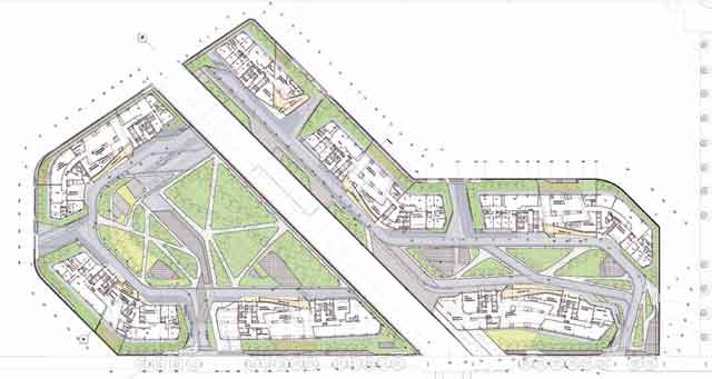 Planimetria. Le residenze occupano due lotti dell´intera area di sviluppo, separati da un percorso pedonale che conduce a un parco pubblico.