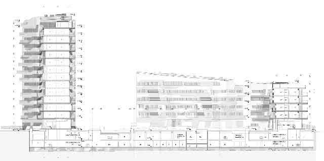 La sezione di tre dei sette edifici, che si sviluppano su diverse altezze. La corte interna a giardino copre i due piani interrati di garage e parcheggi