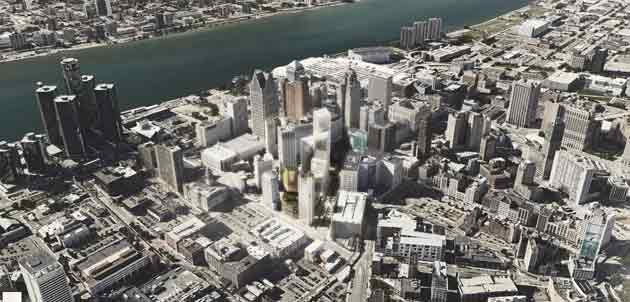 Vista dall´alto del centro cittadino di Detroit, con l´inserimento del complesso multifunzionale di Monroe Blocks (render, Schmidt Hammer Lassen)