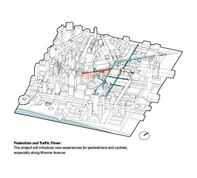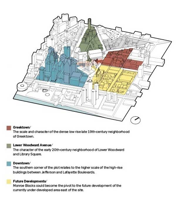 Nel disegno, lo schema di funzionamento e delle relazioni tra il nuovo complesso multifunzionale di Monroe Blocks e gli spazi limitrofi del centro di Detroit (disegno, Schmidt Hammer Lassen)
