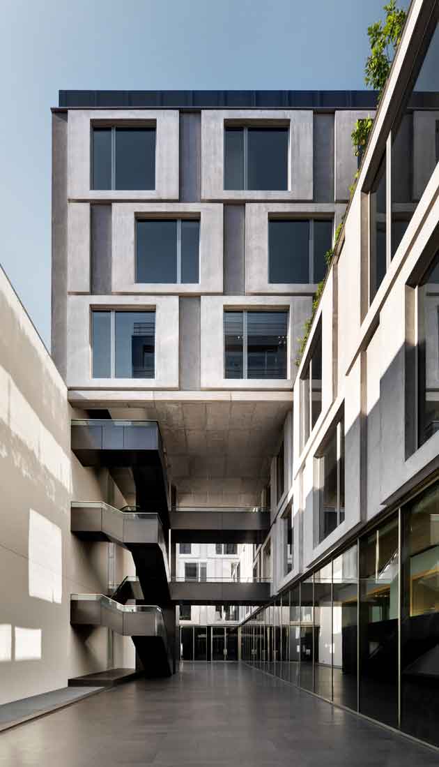 Il linguaggio utilizzato per il fronte su strada, che rimanda a trasparenza e leggerezza grazie all’impiego del vetro e del metallo, si contrappone all’aspetto più austero dei fronti affacciati sulla corte interna. Qui il tema della scacchiera modulare adottato nel prospetto principale è stato ripreso nelle medesime forme e dimensioni, utilizzando però pannelli di GRC (Glass Reinforced Concrete) all’interno dei quali sono collocati i serramenti vetrati. Un layout semplice e funzionale caratterizza gli interni open space degli uffici e degli spazi di collegamento. I soffitti in cemento faccia a vista casserato con doghe di legno presentano travi attrezzate con impianti di condizionamento e illuminazione. Materiali diversi si alternano sulle superfici pavimentali: gres negli uffici, doghe di rovere negli spazi di coordinamento e vecchi legni di recupero nelle aree di rappresentanza. Negli interni a piano terra e nella corte è posata invece la basaltina, pietra scura di origine vulcanica scelta dallo studio anche in altri progetti per Dolce&Gabbana in quanto trasmette una precisa idea di mediterraneità tipica della Maison.