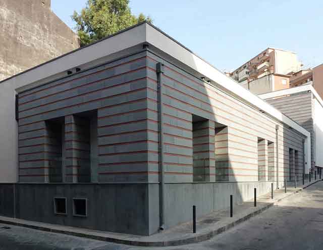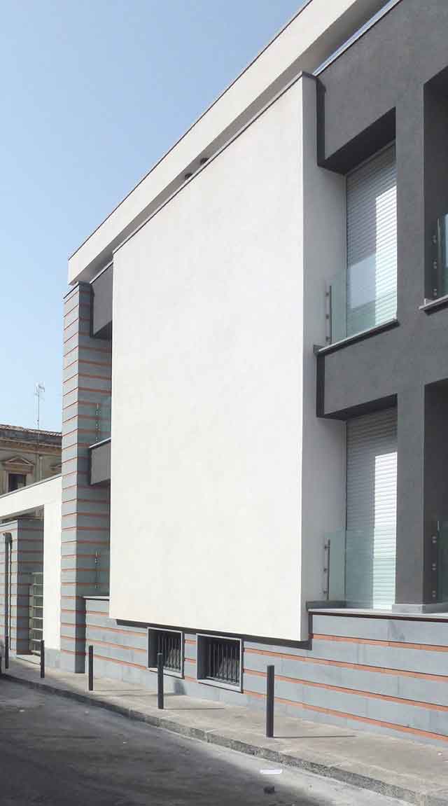 Un lungo corpo orizzontale dialoga a tal fine da un lato con l’edificato storico e si raccorda dall’altro con una energica struttura verticale che, pur senza raggiungere le notevoli altezze del costruito preesistente, si confronta con tali volumetrie. La composizione dei prospetti considera l’intero complesso abitativo come un insieme unitario. I pieni e i vuoti sono ritmati da scansioni verticali che, pur ricercando le migliori condizioni di illuminazione e ombreggiamento naturale dei nuovi ambienti abitativi, si confrontano con le configurazioni dell’edilizia classica del contesto senza rinnegare le condizioni linguistiche della contemporaneità. La trama dei paramenti murari in pietra lavica e laterizio che caratterizzano la storia della tecnologia delle costruzioni della città di Catania e sono presenti negli edifici attigui, è rievocata dalla massa muraria del nuovo. Pietra lavica e laterizio rivestono infatti il basamento dell’edificio, scanditi da fughe orizzontali e, così come una parasta, marcano chiaramente l’angolo. La trave continua in sommità disegna la cornice di chiusura orizzontale, rievocando ancora una volta, ma in chiave moderna, i canoni compositivi dell’edificato storico.