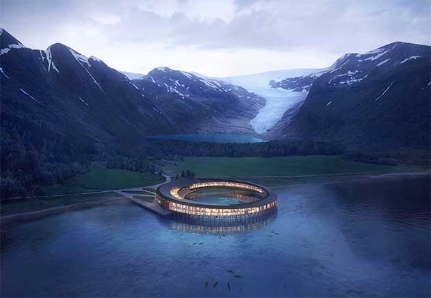 Anche l´hotel Svart, in Norvegia, fa parte del progetto Powerhouse: edifici che producono più energia di quanta ne consumino (render courtesy Snøhetta) |