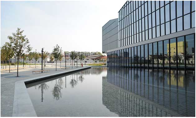 Il complesso Symbiosis, sede tra gli altri di Fastweb e Gruppo Cir, e la nuova piazza Adriano Olivetti a Milano |