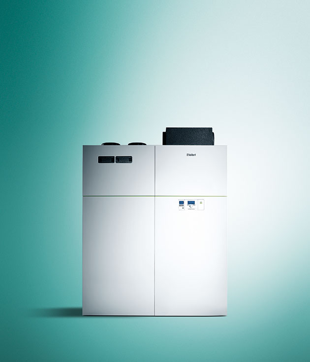 recoCOMPACT di Vaillant è un sistema compatto, alimentato da energia elettrica, che assolve a tutte le funzioni impiantistiche di un´abitazione unifamiliare. In un ingombro limitato (1.600 x 2.150 x 750 mm) contiene un bollitore di acqua calda da 211 litri e il sistema che, collegato a condotti di aerazione, gestisce la ventilazione controllata dell´edificio |