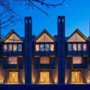 Lastre di pietra breccia irpina bocciardata, evidente richiamo alla tradizione costruttiva locale, si alternano all’intonaco bianco effetto calce, che segna la linea marcapiano, e alle doghe in WPC – un materiale composito in fibre di legno e resine polimeriche – del piano terra, dove trova spazio la zona giorno in stretta relazione con il giardino circostante, attraverso ampie vetrate e aree aperte coperte.