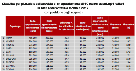 Lo studio contiene un capitolo dedicato al plusvalore ottenibile dalla ristrutturazione che – prendendo come standard un appartamento di 60 mq in zone semicentrali delle principali città italiane e sulla base dei prezzi rilevati a febbraio 2017 – mette a confronto i prezzi di un´abitazione da ristrutturare con quelli di un´analogo alloggio ristrutturato.