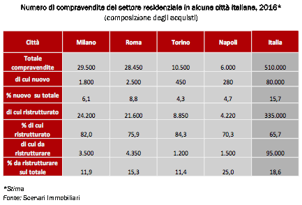 Ciò significa che nell’immediato potrebbe sbloccarsi un mercato potenziale di oltre un milione di case. Già oggi il 19% delle compravendite riguarda case da ristrutturare (con punte del 25% a Napoli). Il numero aumenta esponenzialmente se si considerano anche le unità immobiliari abitate dello stock che avrebbero ugualmente bisogno di manutenzione straordinaria, per un investimento stimato in 50 miliardi di euro.
