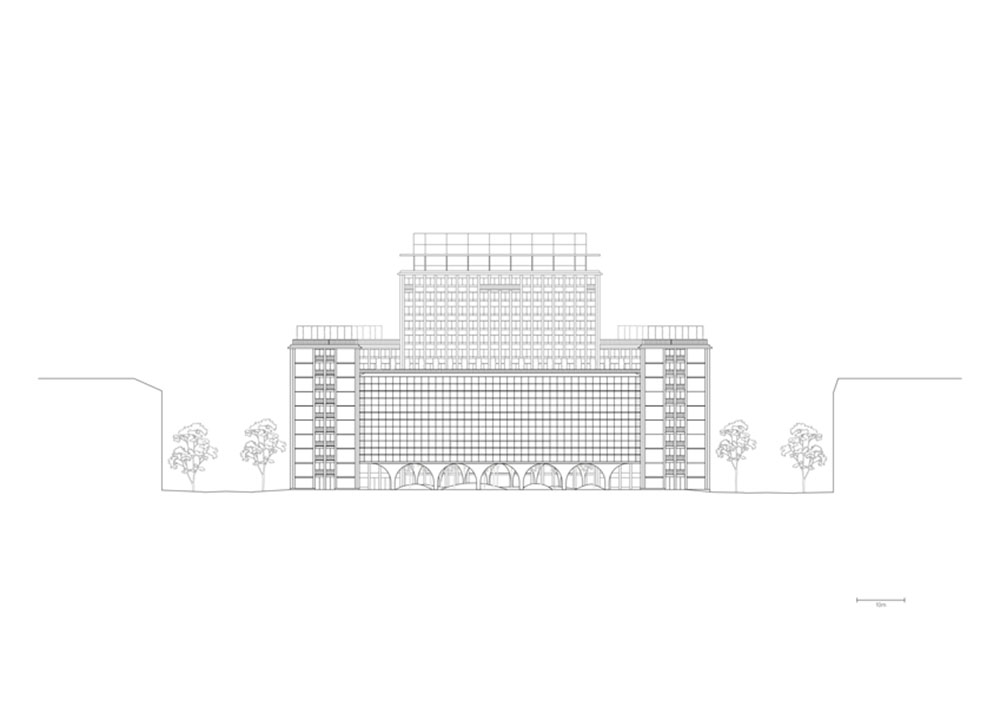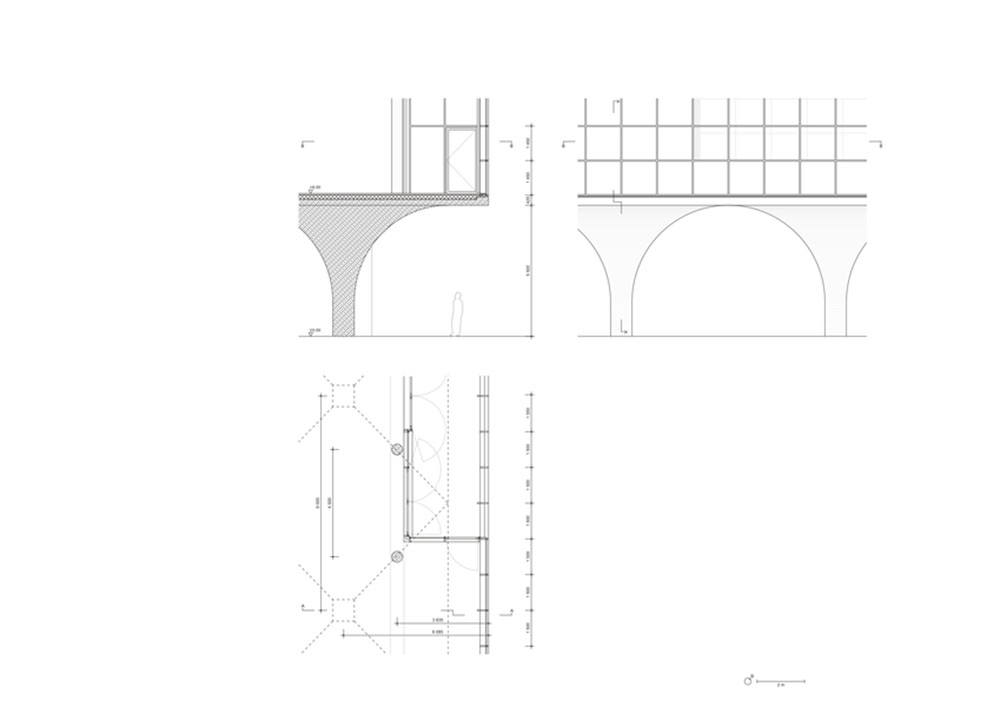 Le arcate portanti a volta caratterizzano il piano terra e fanno da contrappunto alla rigida griglia di colonne dell’insieme esistente, ph. ©Simon Menges.