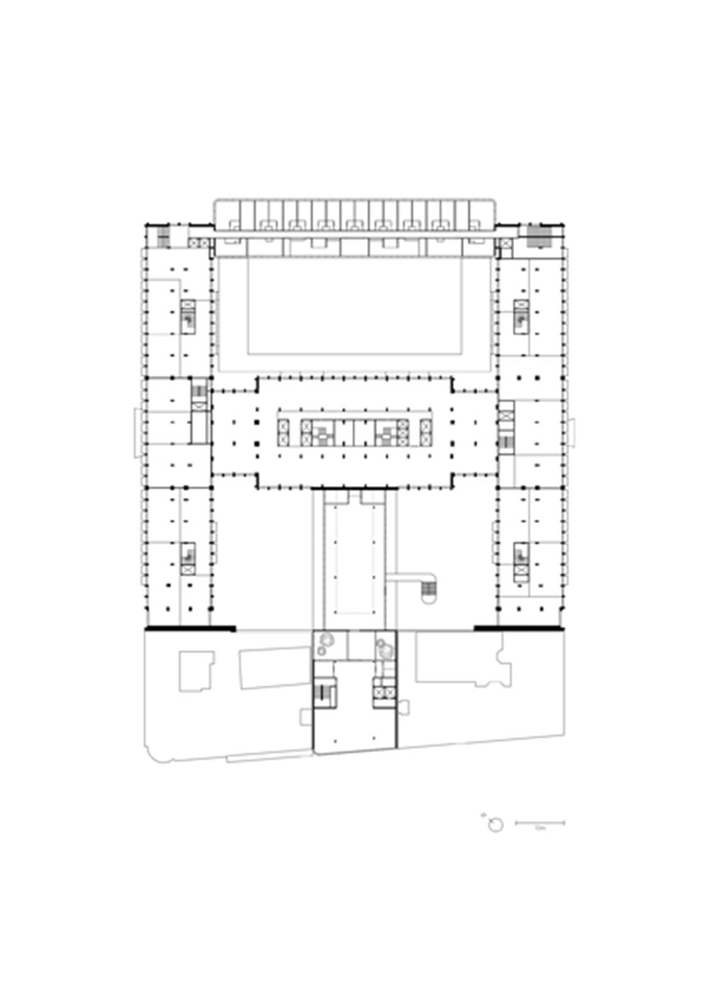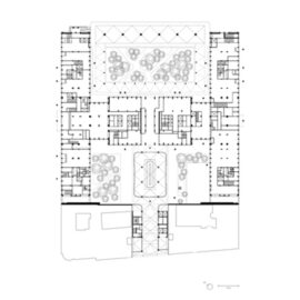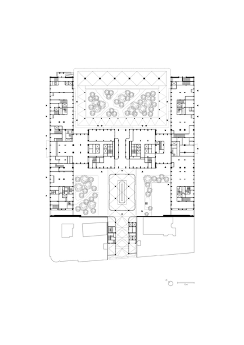 Al piano terra, tre cortili interni compongono un paesaggio piantumato, circondato da terrazze e attraversato da percorsi più informali. Il paesaggio è sia circoscritto all’interno dell’edificio sia inteso come estensione dello spazio pubblico. Data la ridotta insolazione dell’ambiente costruito, Michel Desvigne ha trasposto qui una foresta in miniatura fatta di varietà vegetali adattabili alle circostanze specifiche. Alberi di varie dimensioni, cespugli, piante erbacee, felci sono stati scelti in combinazione tra loro e resi oggetto di un lavoro di composizione e acclimatazione.