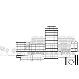 Il ciclo energetico, compreso il riscaldamento e il raffreddamento, è stato progettato secondo lo stesso principio: basandosi sullo scambio di calore, i diversi usi all’interno del progetto possono trarre vantaggio l’uno dall’altro. Il calore di scarto generato nelle aree degli uffici facilita, per esempio, la fornitura di acqua calda nell’hotel, collegando gli impianti a pompe di calore tramite un circuito idrico. Questo sistema riduce il consumo totale dell’edificio del 15% rispetto alle norme prescritte. L’energia supplementare necessaria è fornita da sistemi collettivi di teleriscaldamento e raffreddamento. Inoltre, i sui tetti sono installati pannelli fotovoltaici.