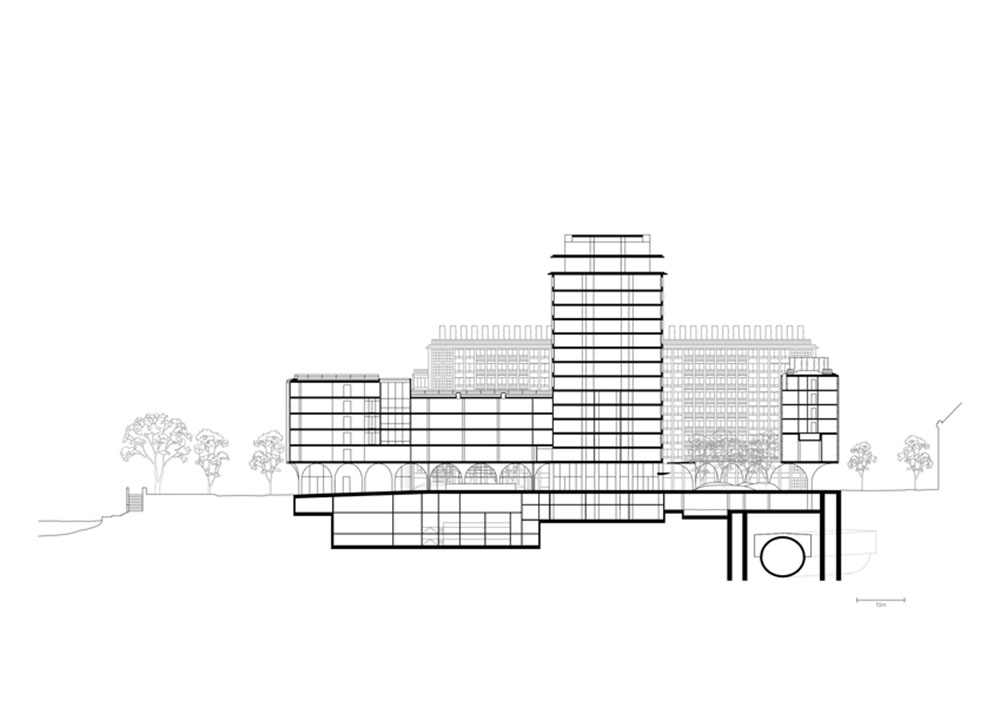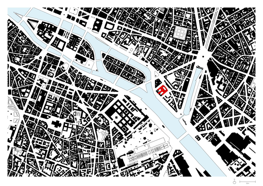 Per mediare il rapporto tra la grande scala del vecchio complesso e le costruzioni circostanti, sono stati realizzati due nuovi edifici sul Boulevard Morland e sulle rive della Senna. I due nuovi volumi, sostenuti da un sistema di archi e volte, sono sollevati dal suolo per creare un nuovo asse pubblico di passaggio dal viale alla Senna, sul Quai Henri IV.
