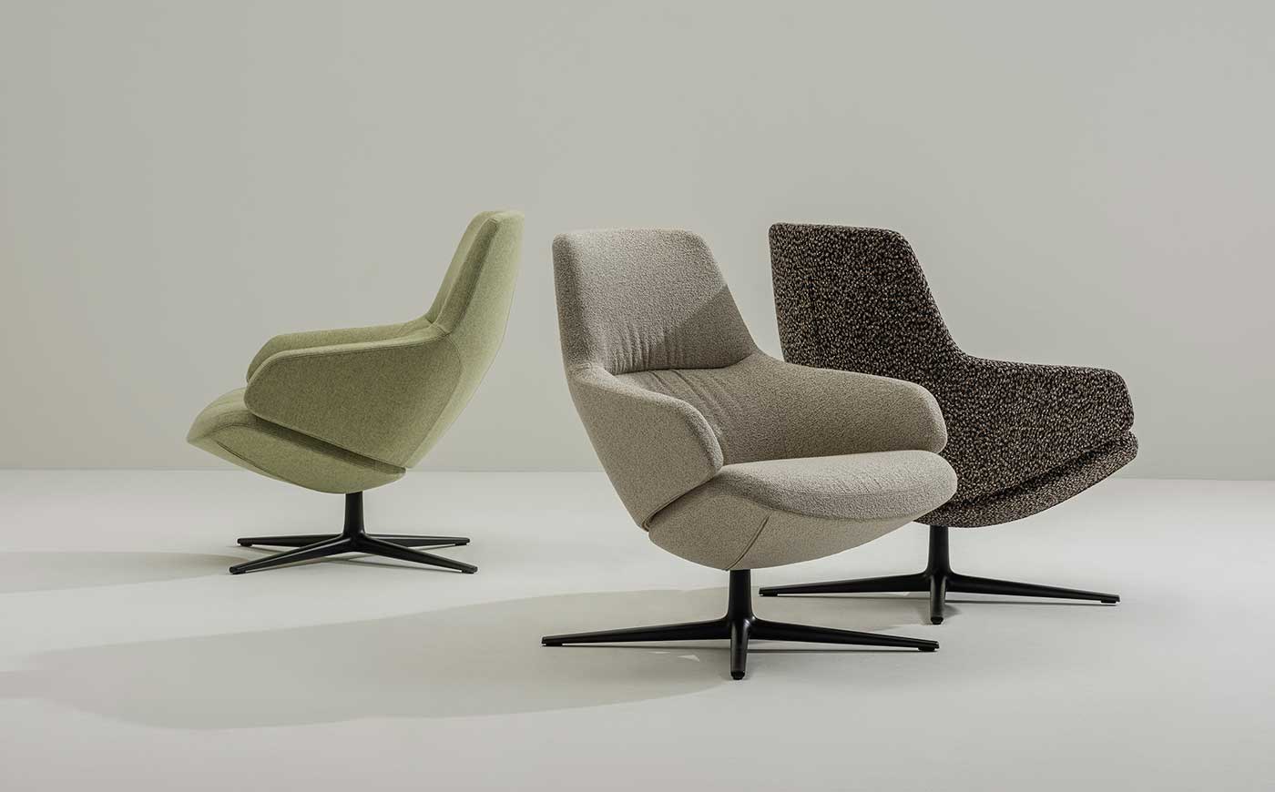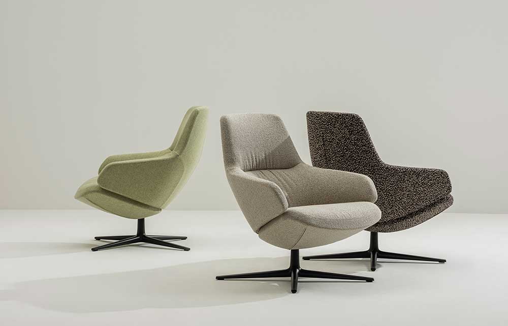 La base è disponibile in alluminio a quattro razze lucidato o verniciato. Infine è possibile personalizzare la seduta con un’ampia gamma di finiture, trasformandola in un prodotto versatile e senza tempo.