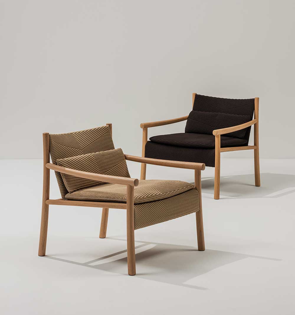 La struttura, disponibile in rovere o robinia, entrambi certificati FSC, sostiene la scocca, realizzata in tessuto 3D realizzato con filati di poliestere post consumo trasformato in fibre leggere e durevoli. Disponibile in maglia 3D knit con pattern grafico e micro imbottitura interna, nei toni naturali del lino, del grano e del carbone, oppure maglia 3D knit con motivo a righe, nei colori acqua, grano, carbone, il tessuto è tecnologicamente concepito per adattarsi al fusto della seduta, riducendo al minimo gli scarti di materiale.